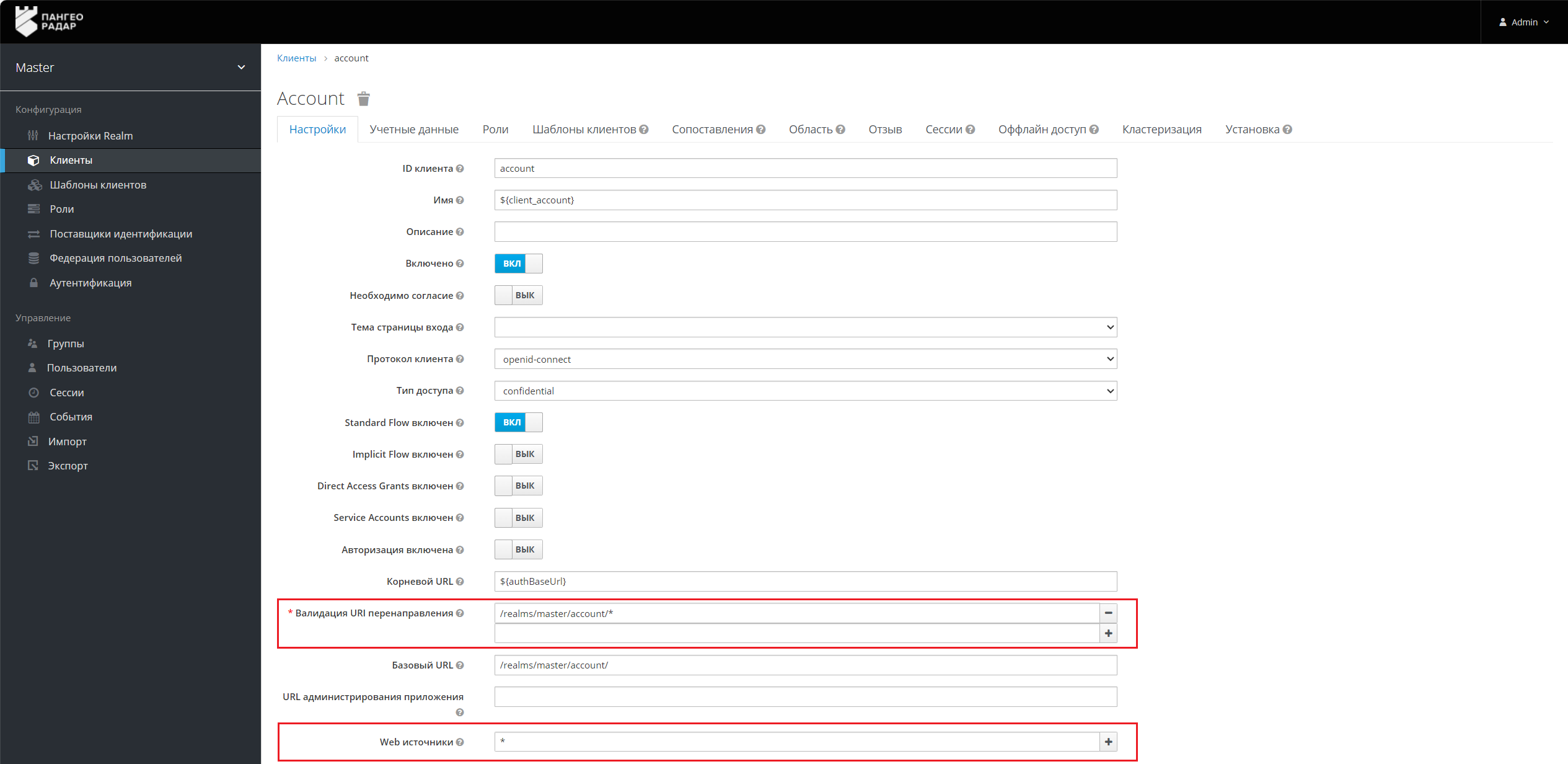 - Валидация URI перенаправления – укажите паттерн URL, на который будет перенаправлен браузер после успешного входа или выхода. Разрешены простые ссылки, например