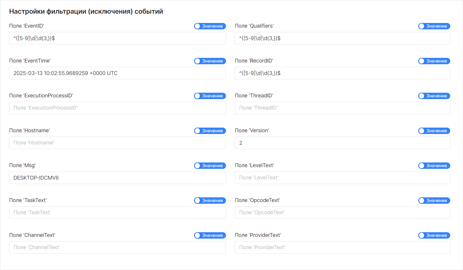 - Черный список – события, которые соответствуют регулярному выражению, блокируются и не попадают в очередь на отправку.