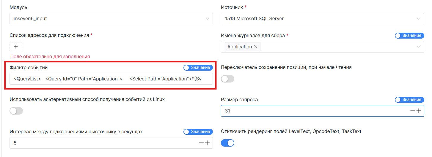 В поле SQL запрос укажите запрос, которым будут запрашиваться события из системных журналов. Пример запроса:
