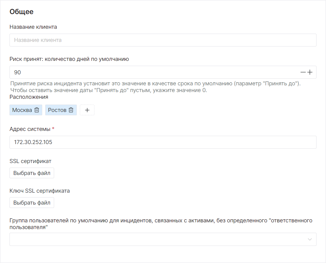 - в поле Риск принят: количество дней по умолчанию укажите количество дней, по истечении которых будет принят риск инцидента. Значение будет автоматически добавлено в поле инцидента Принять до. Чтобы оставить значение поля Принять до пустым, укажите значение 0;