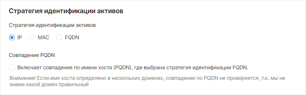 - в поле Стратегия идентификации активов выберите одну из стратегий (IP, FQDN, MAC), которая будет применена при идентификации активов (подробнее про идентификацию активов см. раздел Настройки идентификации активов);