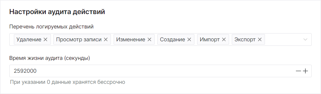 в поле Время жизни аудита (секунды) укажите время жизни записи о действии пользователя в платформе. При значении "0" записи будут храниться бессрочно.