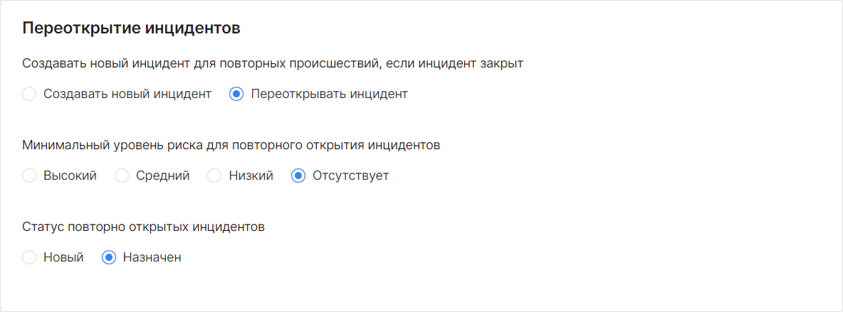 - выберите минимальный уровень риска для повторного открытия инцидента: высокий, средний, низкий, отсутствует;